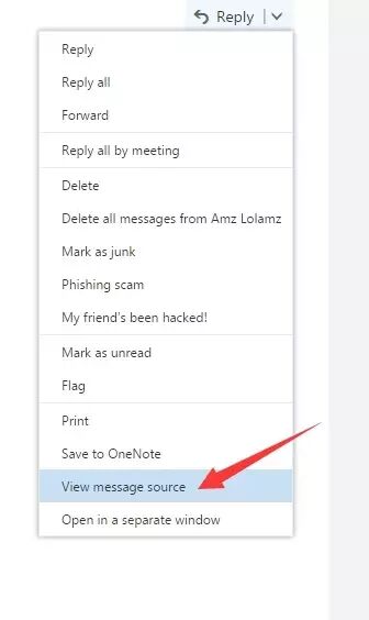 上面是gmail的源文件代码,那么如果是Hotmail呢?一样我们打开具体的邮件,选择 “View message source”就可以选择代码了。