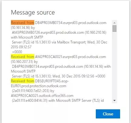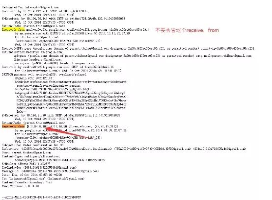 邮件中类似:Received: from mail-wi0-x231.google.com (mail-wi0-x231.google.com [2a00:1450:400c:c05::231])